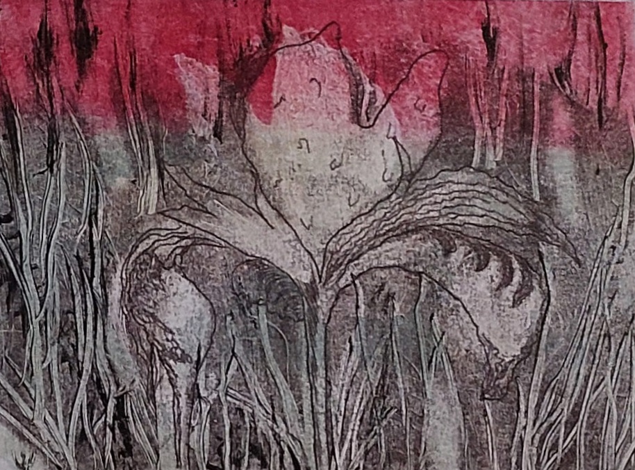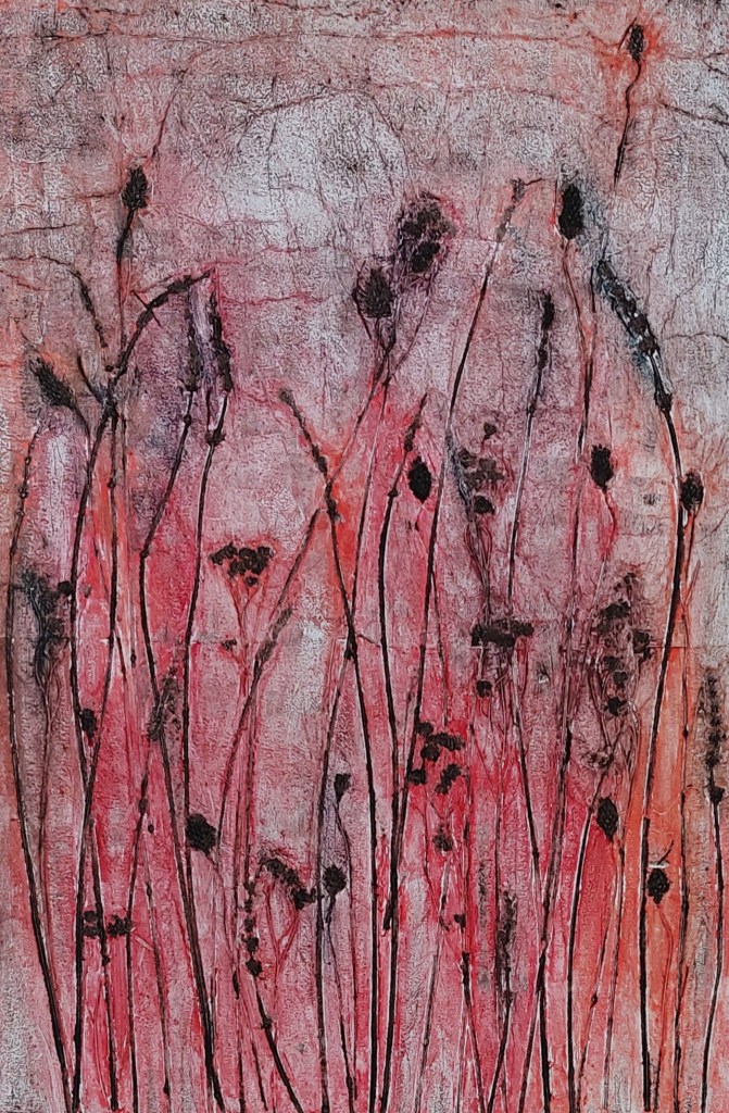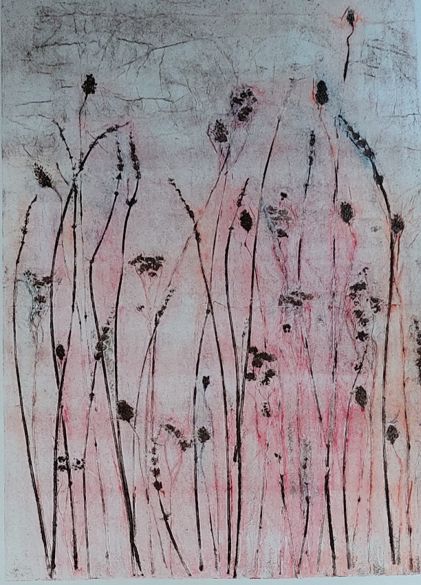 Zeewier (2022) – kleine gelprints van 15 x15 cmStormboom (2022)- materiaaldruk van zand, lijm en aluminiumfolie, 30 x 40 cmVeldgras I (2021)- materiaaldruk van grassen 42 x 60 cm (verkocht)Veldgras II (2021) – materiaaldruk van grassen, 42 x 60 cm (verkocht)De treurboom (2021)- materiaaldruk van touw en aluminiumfolie, 38 x 45 cmIris Germanica I (2018) – Monotype 30 x 40 cmIris Germanica II (2018) – Monotype 30 x 40 cm